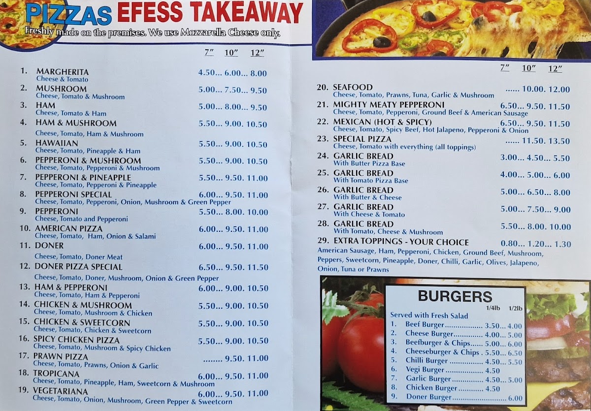 Introducing the menu at Efess Pizza & Kebab House is a delightful experience for food enthusiasts in Skegness. Located at 66 Castleton Blvd, this culinary gem offers an impressive selection of pizzas and kebabs that cater to various tastes. Start your meal with their tempting garlic breads, available in multiple sizes and flavors, including buttery and cheesy variants.